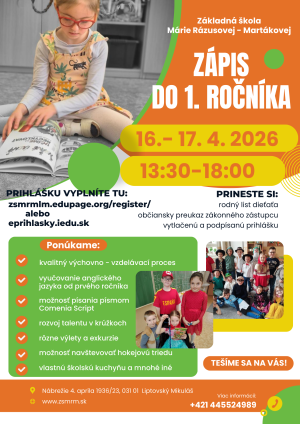 Vážení rodičia, milí budúci prváci, Základná škola Marie Rázusovej – Martákovej si Vás dovoľuje srdečne pozvať na zápis do prvého ročníka pre školský rok 2026/2027, ktorý sa uskutoční 16. a 17. apríla 2026 v čase od 13:30 do 18:00 v priestoroch školy.