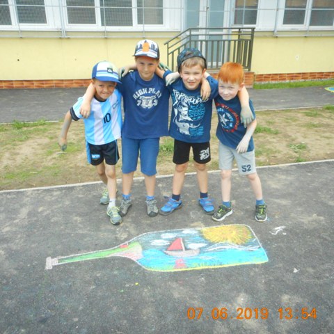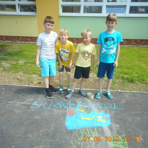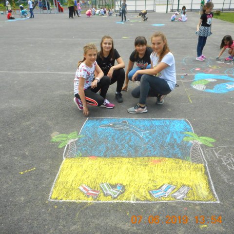 V piatok 7. júna 2019 si deti školského klubu pripomenuli svetový deň morí a oceánov. Na asfaltovej ploche vyjadrili svoj vzťah k slanej vode.